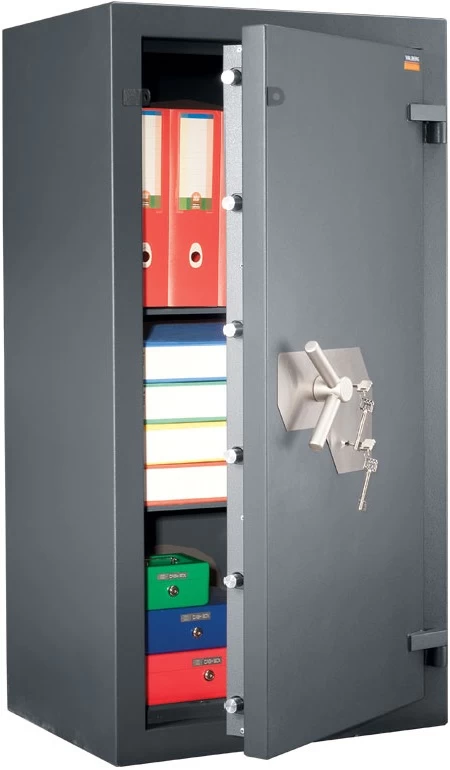 ФОРТ-1368 KL оборудован мощным ригельным механизмом: десять ригелей прочно запирают его по трём сторонам; также имеются пассивные ригели. На данную модель установлено два ключевых замка высокого качества KABA MAUER, производства Германии (в комплекте три ключа). Замки и ригели защищены от силового воздействия; кроме того, предусмотрено блокирование ригелей в закрытом состоянии при попытке взлома.